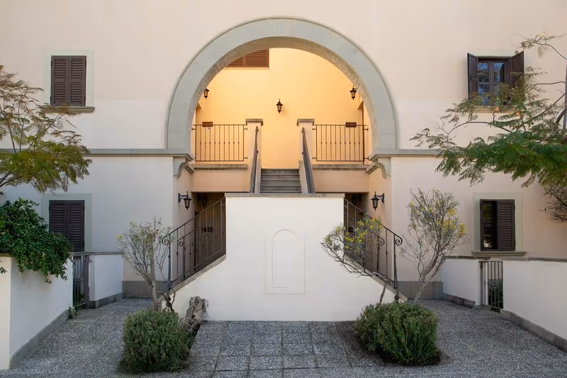 Venture down the corridor to discover the spacious bedroom, a sanctuary of luxury and style. The room features a plush double bed, complemented by elegant parquet flooring and coordinating soft furnishings. Shuttered French doors open onto a secluded terrace, where fragrant plants enhance the ambiance. The en-suite bathroom is a masterpiece of design, fully tiled and offering both a bathtub and a separate shower, along with "his and hers" washbasins set in a marble vanity unit.