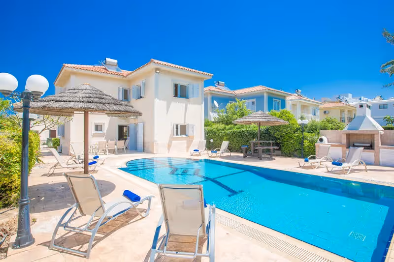 Villa Margaritta in Coral bay, Cyprus. This villa couldn't be better situated, It's on the outskirts of the town so quieter than some. It is literally across the road, through the taverna car park and fall on the beach! It was ideal. Layout is spacious, and we did heat the pool and hottub. One small issue which was rectified and sorted within 2 hours, so can't fault the staff. The only downside I can find was the small ants that fell into the pool and stung for a while. Poolman sorted that too!