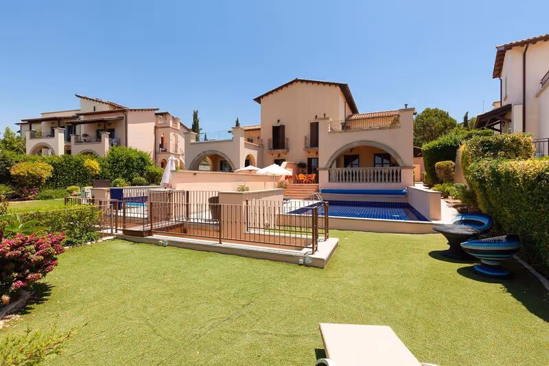 Utopia's outdoor space is nothing short of spectacular. An overflow swimming pool with Roman steps is the centerpiece, surrounded by a spacious terrace perfect for sunbathing. A vast lawned area provides ample space for children to play, while the covered patio area offers a shaded retreat with a dining table and chairs for outdoor meals. A barbecue, sun loungers, and umbrellas complete this idyllic setting, making it the perfect spot to relax and soak up the Mediterranean ambiance.