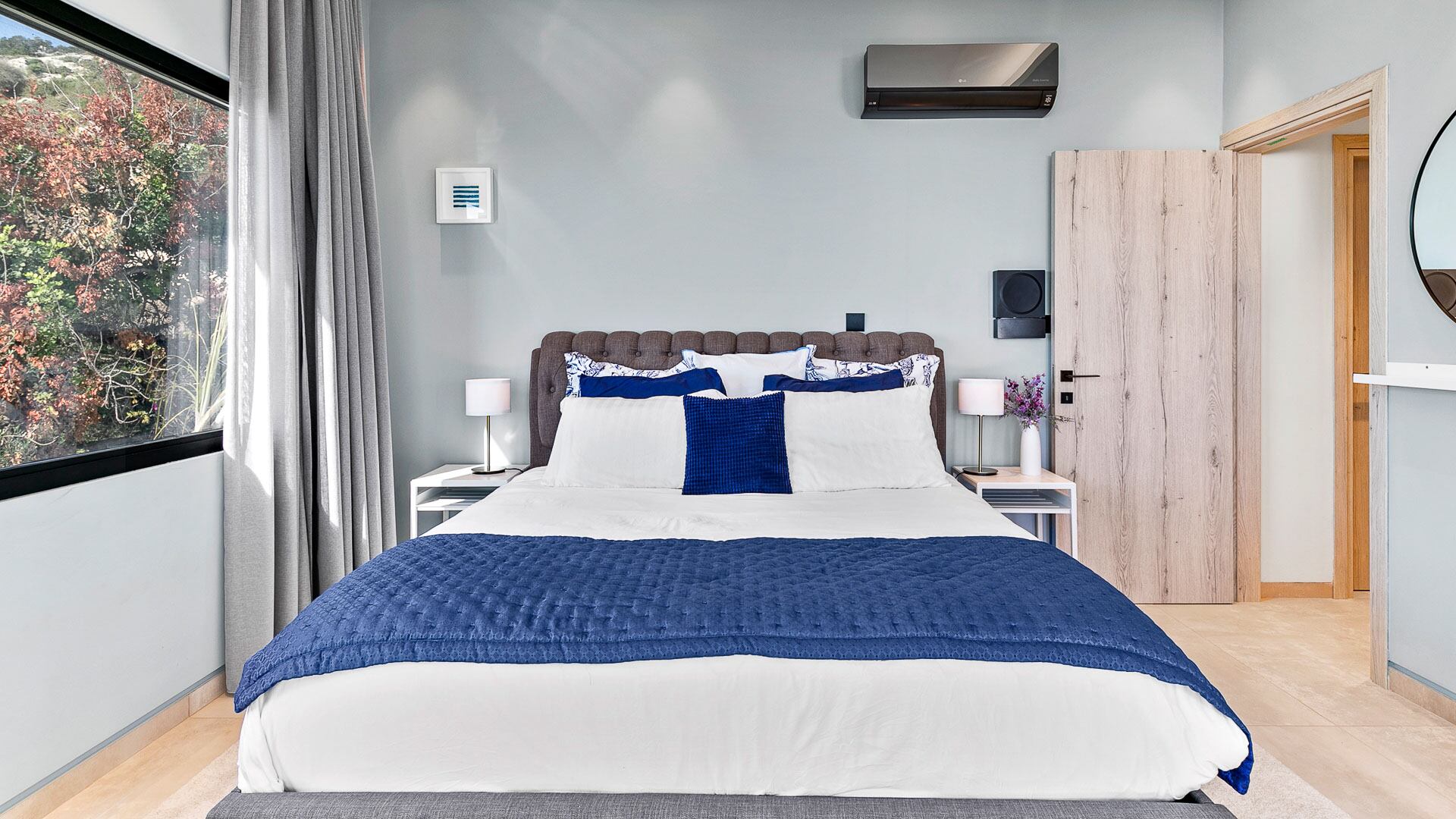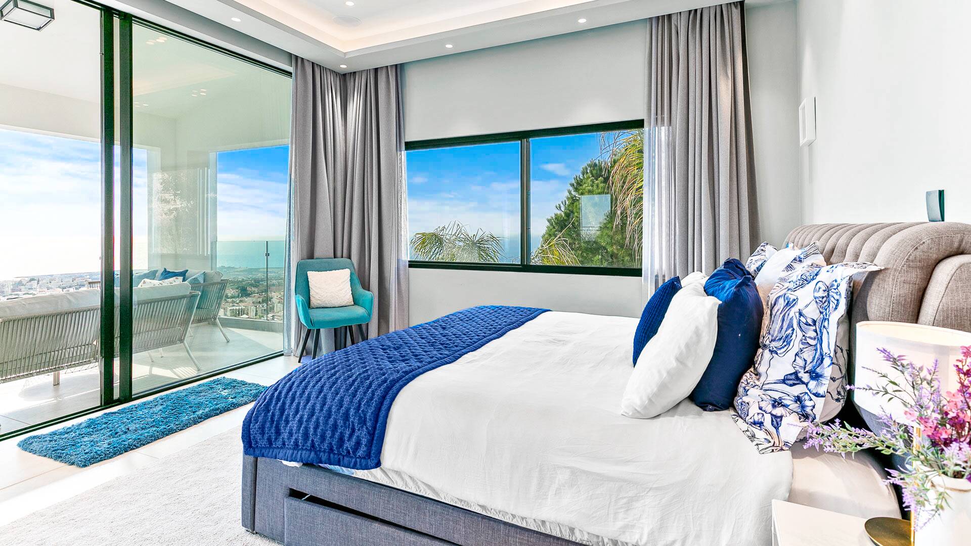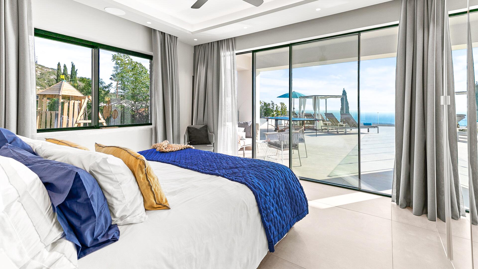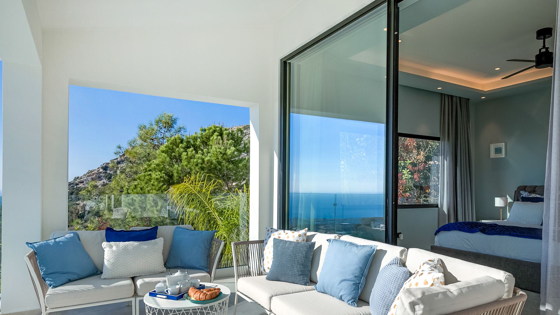 Venturing to the first level, you’ll find a double bedroom with an en-suite shower room, three more double bedrooms, all with patio doors leading to the vast balcony boasting soft seating and overlooking the pool area and the impressive coastline view. There is an additional room on this level that has two double beds and can comfortably sleep up to four guests.