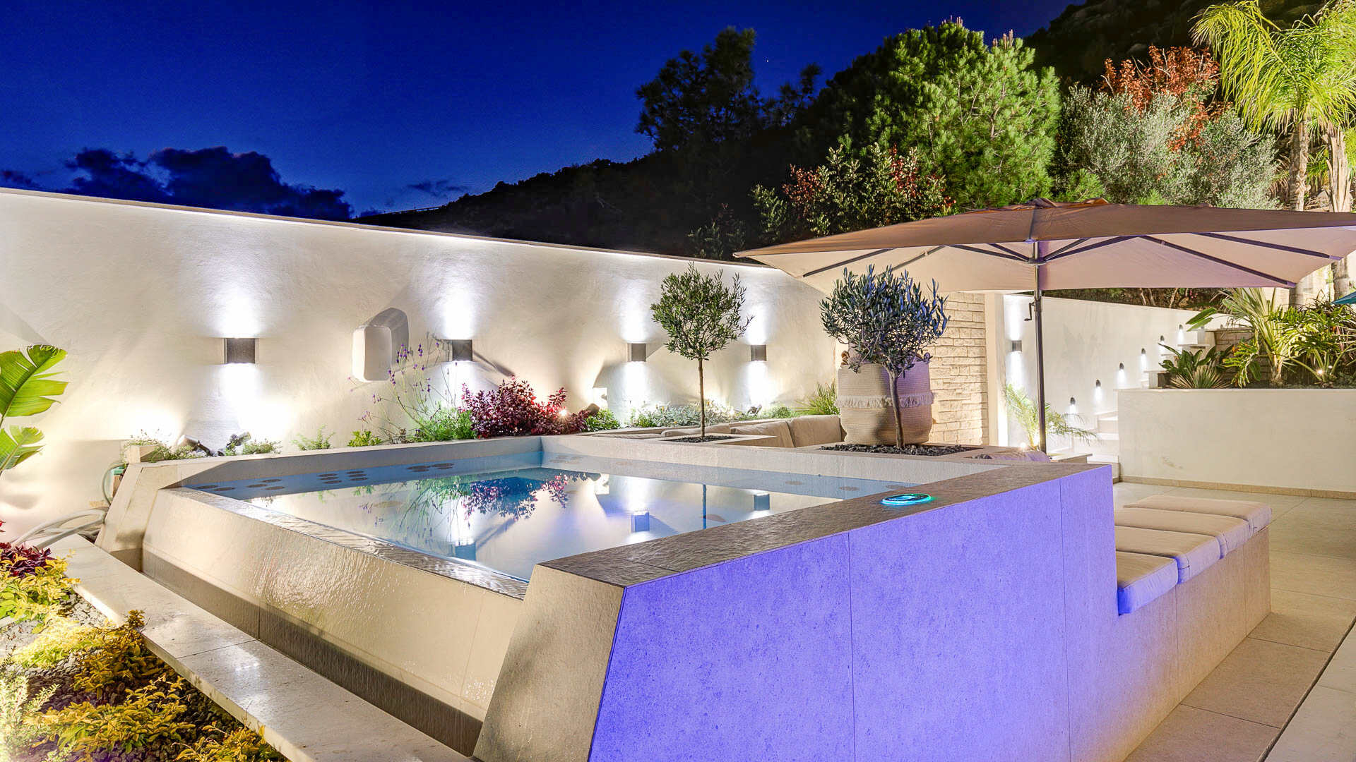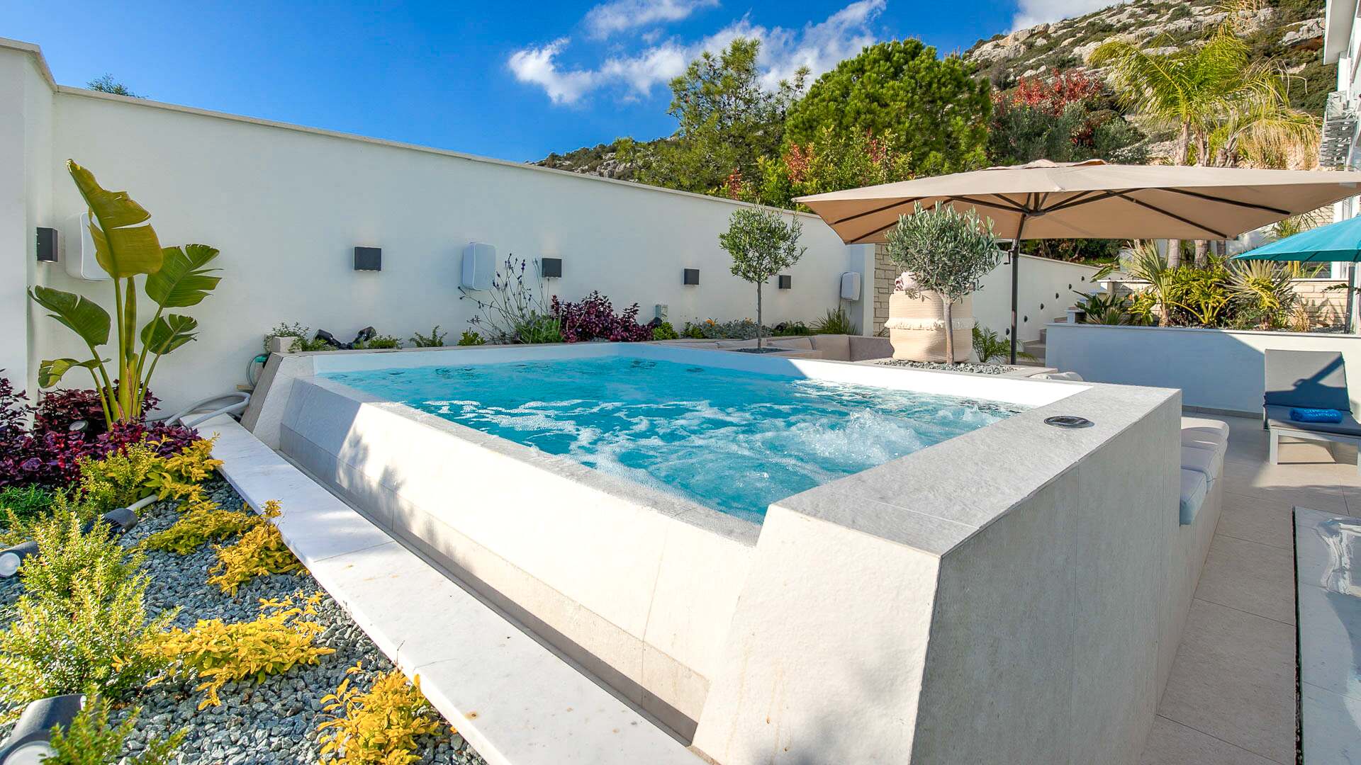 - Private tiered pool with built-in sunbeds (heating, optional extra)