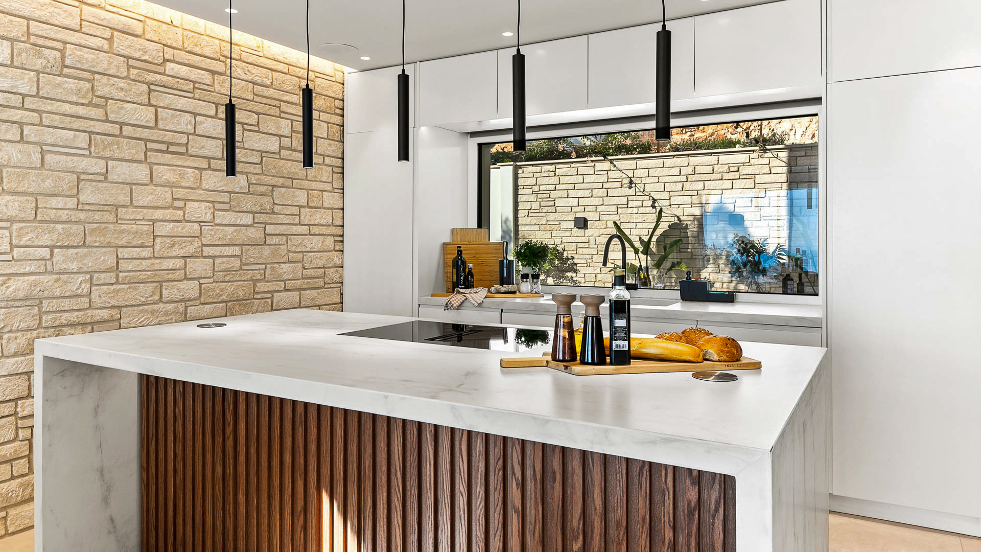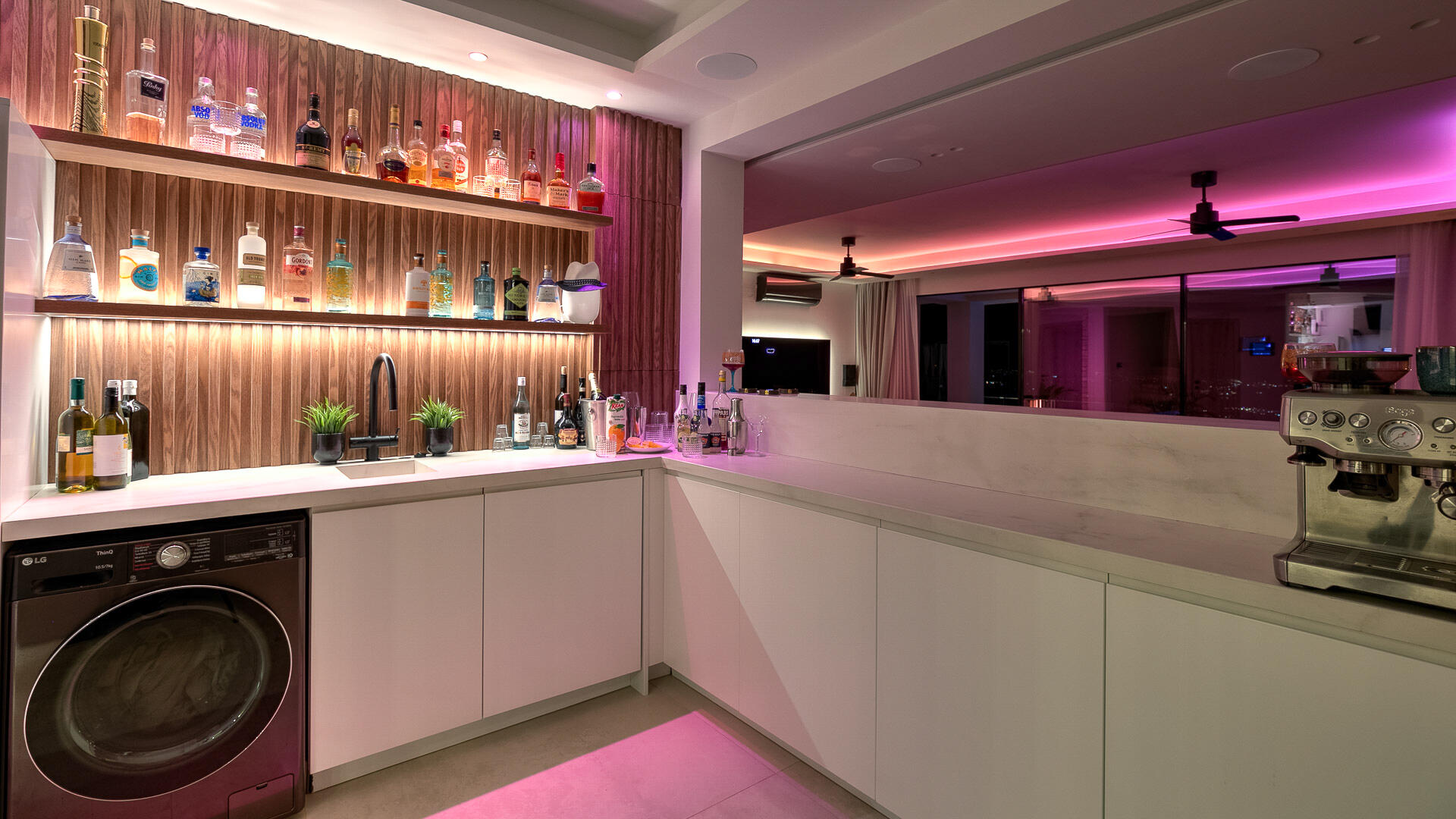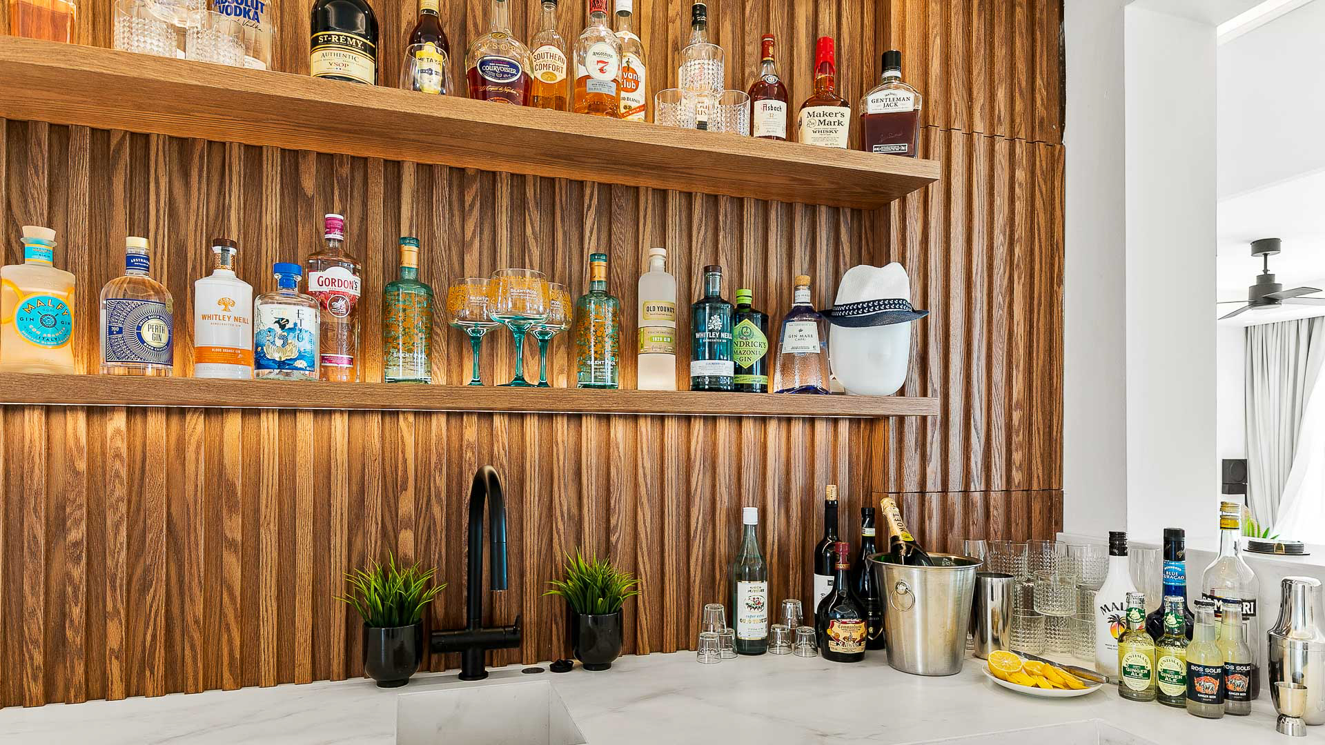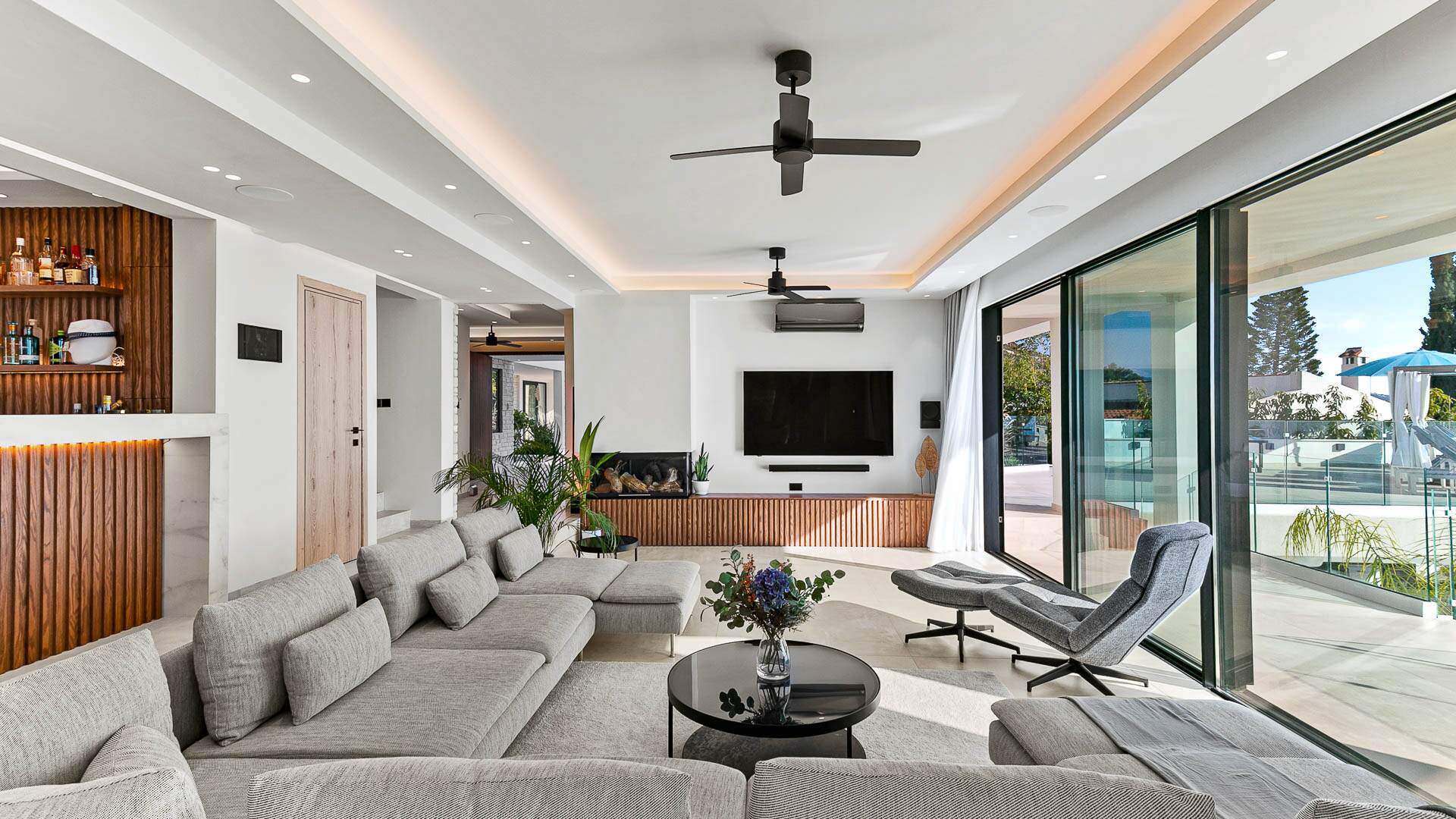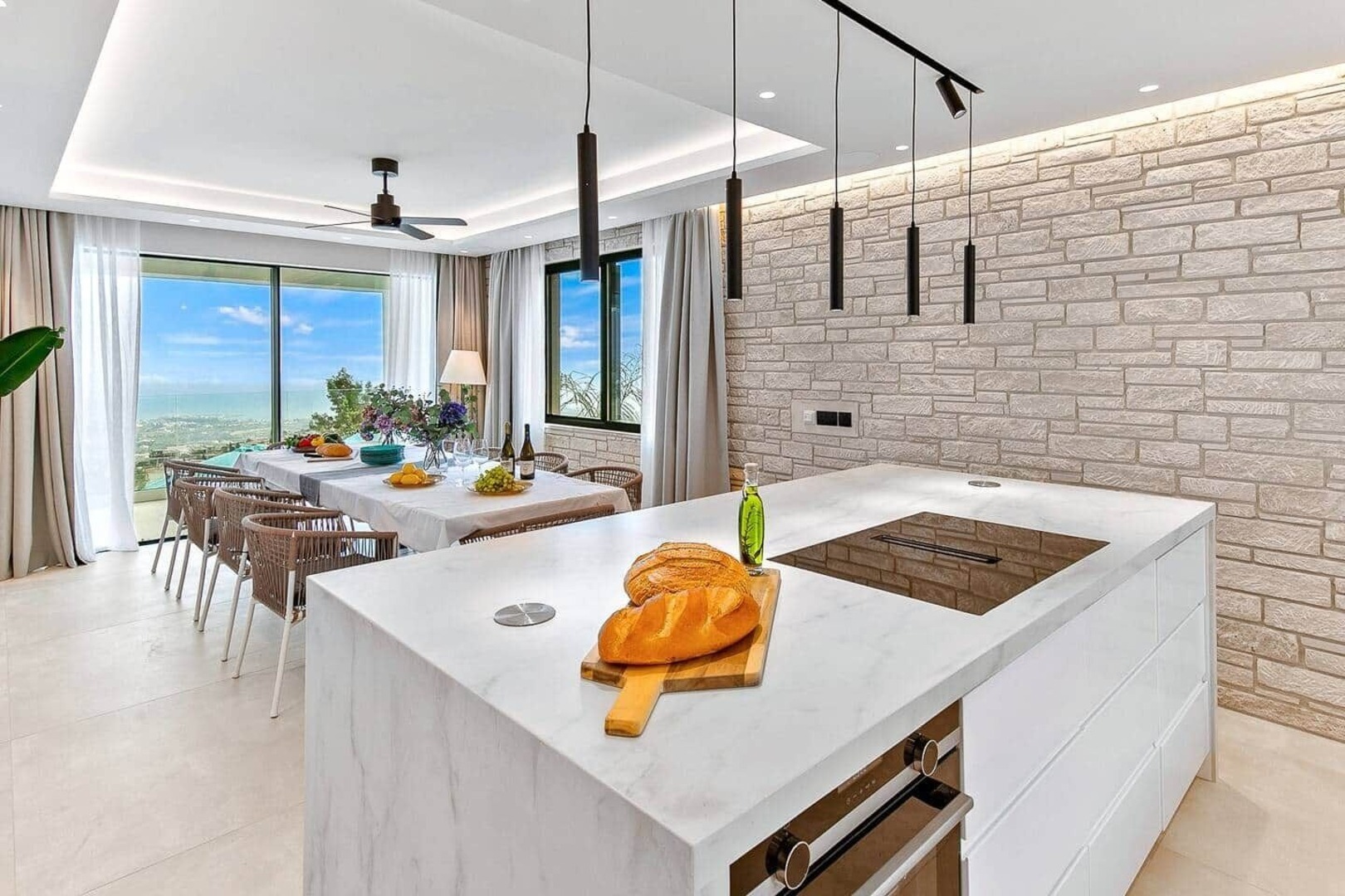 Moving inside, the villa interior is a masterpiece, crafted with meticulous attention to detail and premium materials radiating a distinct aura of grandeur and comfort with an open-plan design that encompasses a large comfortable lounge adorned with huge sofas, a 77″ flat-screen TV and a feature log burner, please note, the log burner is for decorative purposes only and not available for guest use. The dining area features a bespoke built table and stylish chairs for memorable meals with family and friends. Floor-to-ceiling sliding glass doors showcase the breathtaking coastline views ensuring abundant natural light and facilitating seamless indoor-outdoor connectivity. The gourmet kitchen is a chef’s delight, equipped with state-of-the-art appliances, including a full-size integrated fridge, full-size integrated freezer, two dishwashers, wine fridge, washing machine, oven/microwave combi and an induction hob with a built-in extractor laid into a waterfall-edge island. Both the indoor and outdoor kitchens are meticulously provisioned, sparing you the need to transport items back and forth.