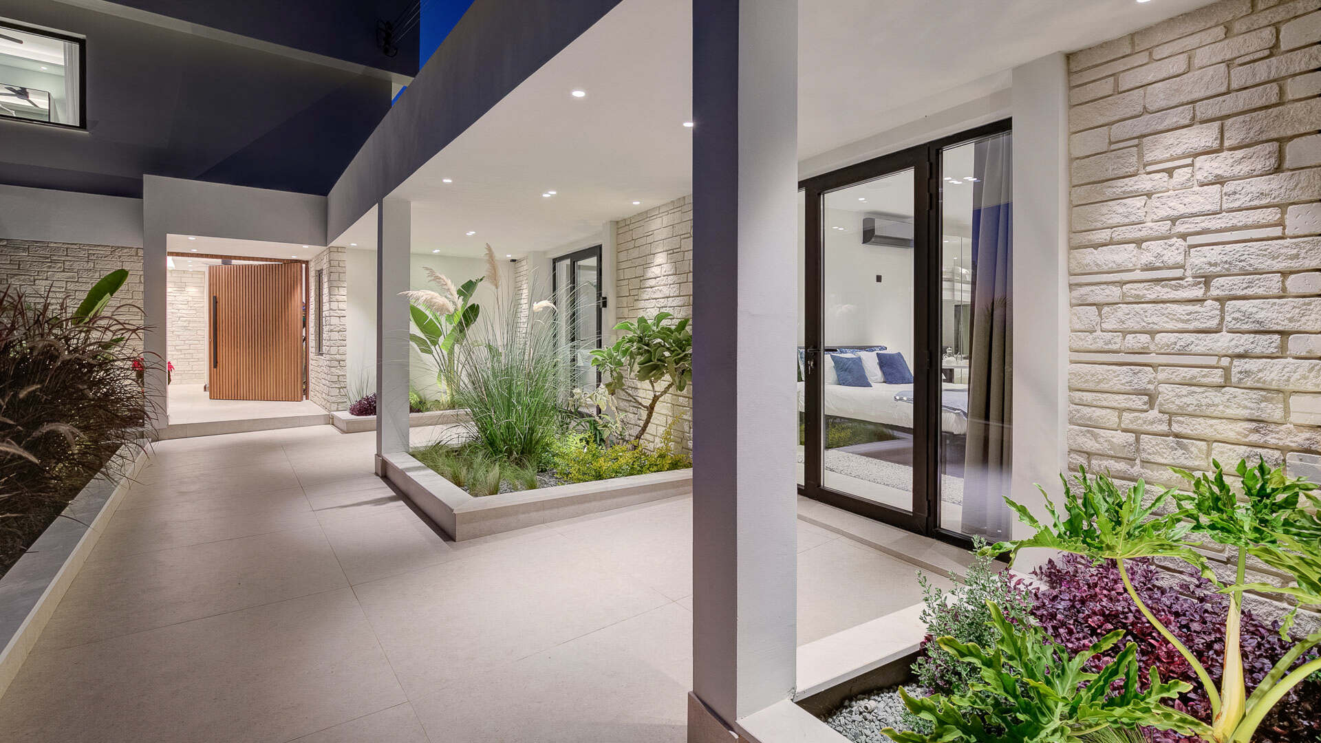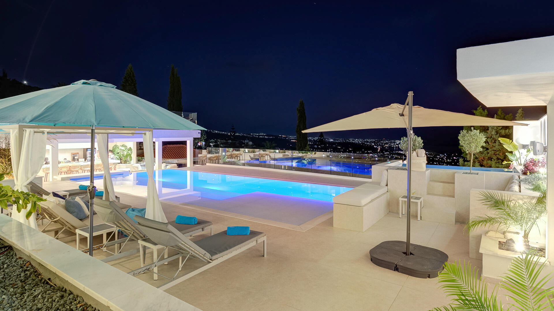 The outdoor space is a paradise of relaxation and entertainment. The private pool boasts multi-layered levels, built-in sunken sunbeds and swim-up bar, providing the perfect spot to soak up the sun’s rays. Indulge in ultimate relaxation experiencing luxurious hydrotherapy at its finest in the built-in stone hot tub with massage jets which can be heated or cooled to match the climate or unwind in the soft seating areas scattered around the villa’s exterior. Sun loungers offer tranquil moments, and the double cabana invites you to bask in the amazing panoramic views. The gardens are adorned with a lush tropical theme, creating a paradise of exotic beauty. There is an additional sun bathing level which also boasts a luxury cabana and sun loungers and is the perfect view-point to take in that awe inspiring vista. Furthermore, you’ll discover an electric vehicle charging station on the premises for your eco-conscious travel needs.