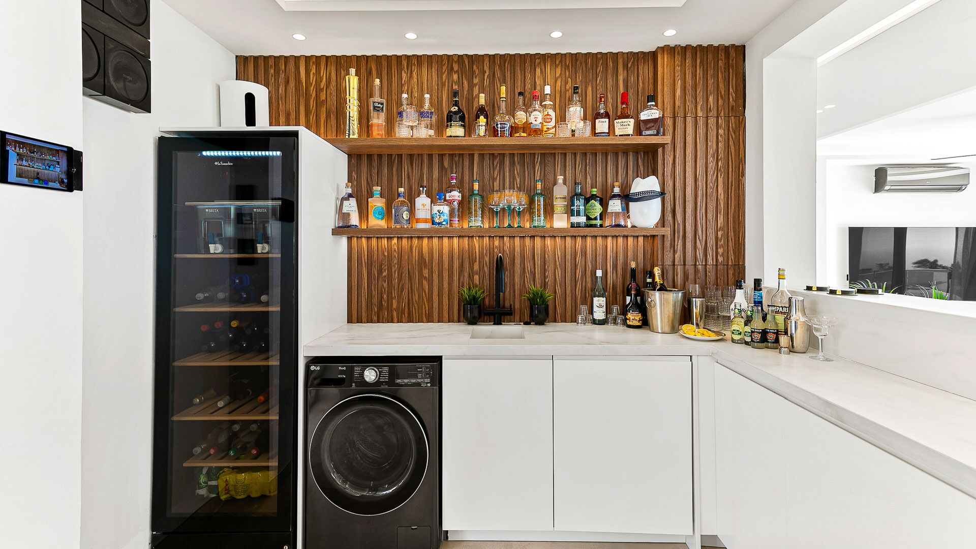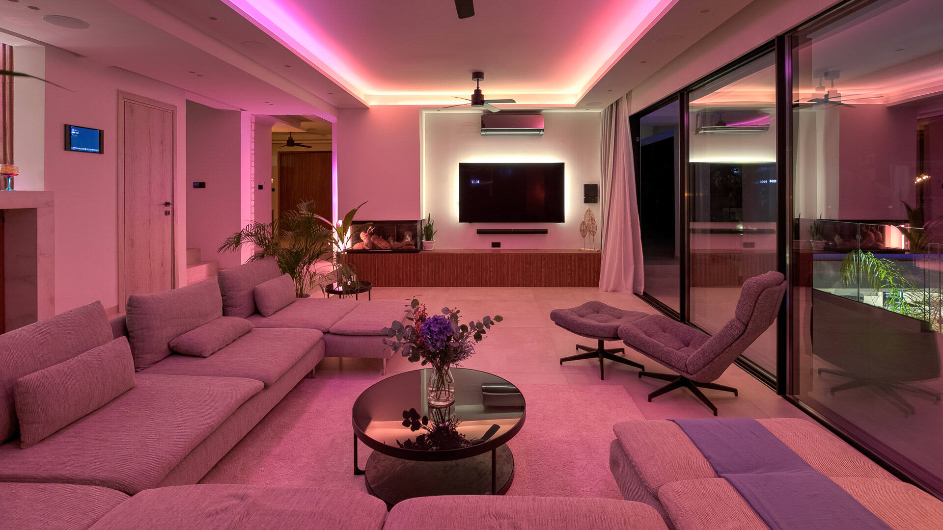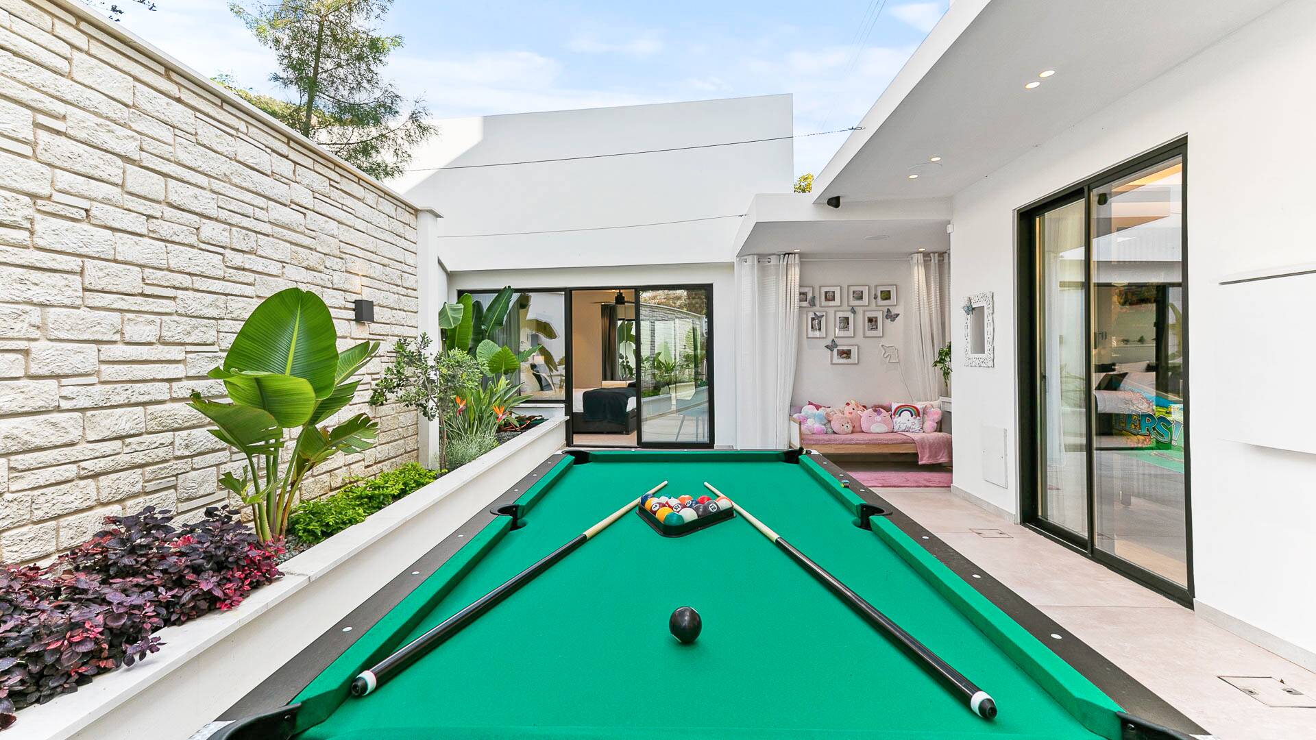 The ground floor also houses a double annexed room with sliding doors leading to the pool area and a family shower room for added convenience. On this level you will also find retro pinball machine, promising hours of enchanting recreation. Throughout the entire villa, you’ll find air conditioning and a state-of-the-art Sonos sound system, ensuring maximum comfort and entertainment.