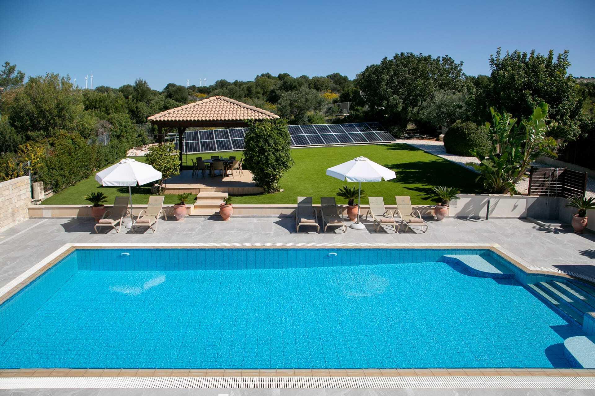 The villa's outdoor spaces are nothing short of spectacular. A meticulously landscaped garden surrounds a large, inviting swimming pool, where you can bask in the sun on comfortable sunbeds or take a refreshing dip in the crystal-clear waters. The pool area is complemented by a built-in gazebo, perfect for al fresco dining or sipping cocktails as the sun sets over the horizon. Whether you're lounging by the pool or exploring the garden's hidden nooks, you'll find countless spots to unwind and soak in the serene surroundings.