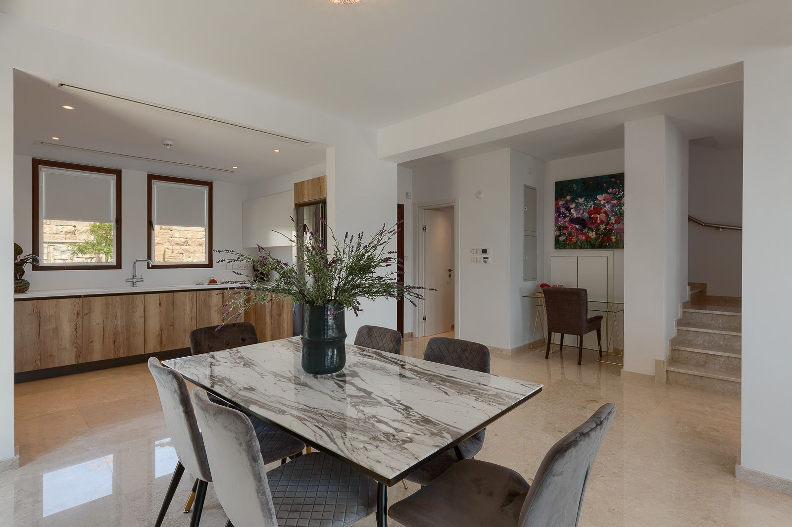 As you step inside Kismet, you are greeted by a world of elegance and style. The villa's interior is a masterpiece of contemporary design, featuring bright and airy open-plan living spaces that exude warmth and comfort. The attention to detail is impeccable, with high-quality wood-finished kitchen units, opulent marble bathrooms, and a seamless blend of marble and parquet flooring throughout. The grand entrance leads you into a spacious living and dining area, where sets of French doors open onto the inviting pool terrace. The lounge is a haven of relaxation, adorned with a plush grey L-shaped sofa, a large flat-screen TV, and tasteful accessories that add a touch of charm. A second lounge area, complete with a cozy blue sofa, offers additional space for unwinding. The adjacent dining area, with its modern table and chairs, seamlessly connects to the open kitchen. Here, you'll find sleek high-gloss and wooden-finished units, fully equipped with top-of-the-line appliances, including an electric oven, hob, integrated dishwasher, washing machine, and microwave. A conveniently located guest WC completes the ground floor, making it perfect for holiday rentals in Aphrodite Hills.
